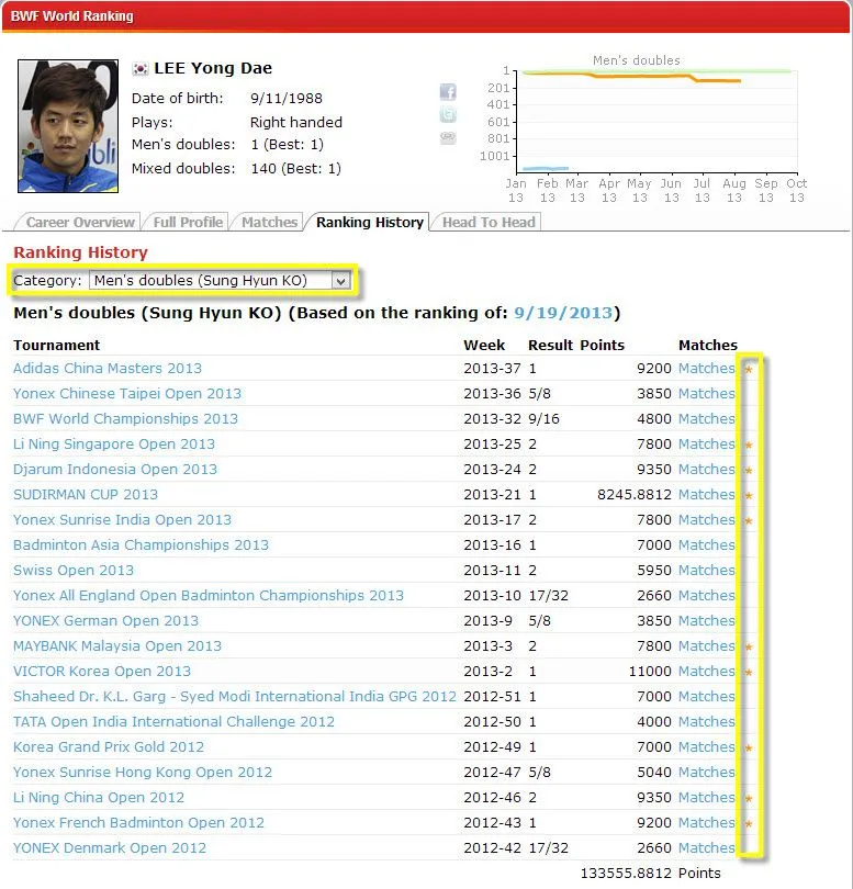 In Ranking History we can find out details of the tournaments a player has played in and points received. As a player might take part in two or more disciplines, (such as men’s doubles, mixed doubles) or play with a different teammate as partner (example: Lee Yong Dae partnered Jung Jae Sung in 2012, in 2013 his partner is Ko Sung Hyun,) you can select a specific discipline/combination to view information about the corresponding individuals.