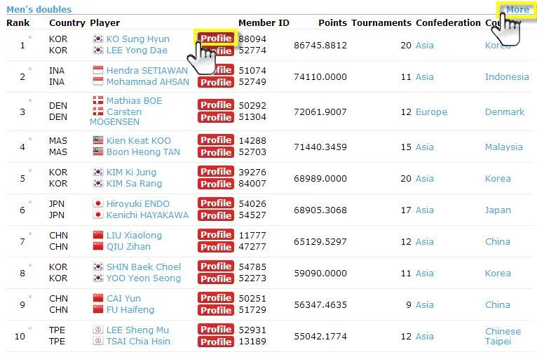If you want to check on a list of players lower than the Top 10, click on “More” on the table. If you want to view detailed information about a particular player (results in various tournaments, match details) click on “Profile” next to members’ ID.