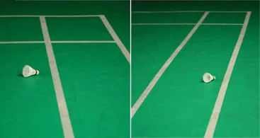 | (Figure 3. inside the line) Official term : In The shuttlecock lands inside the side line (effective points-scoring area) Left:in singles game Right:in doubles game | ![]() |